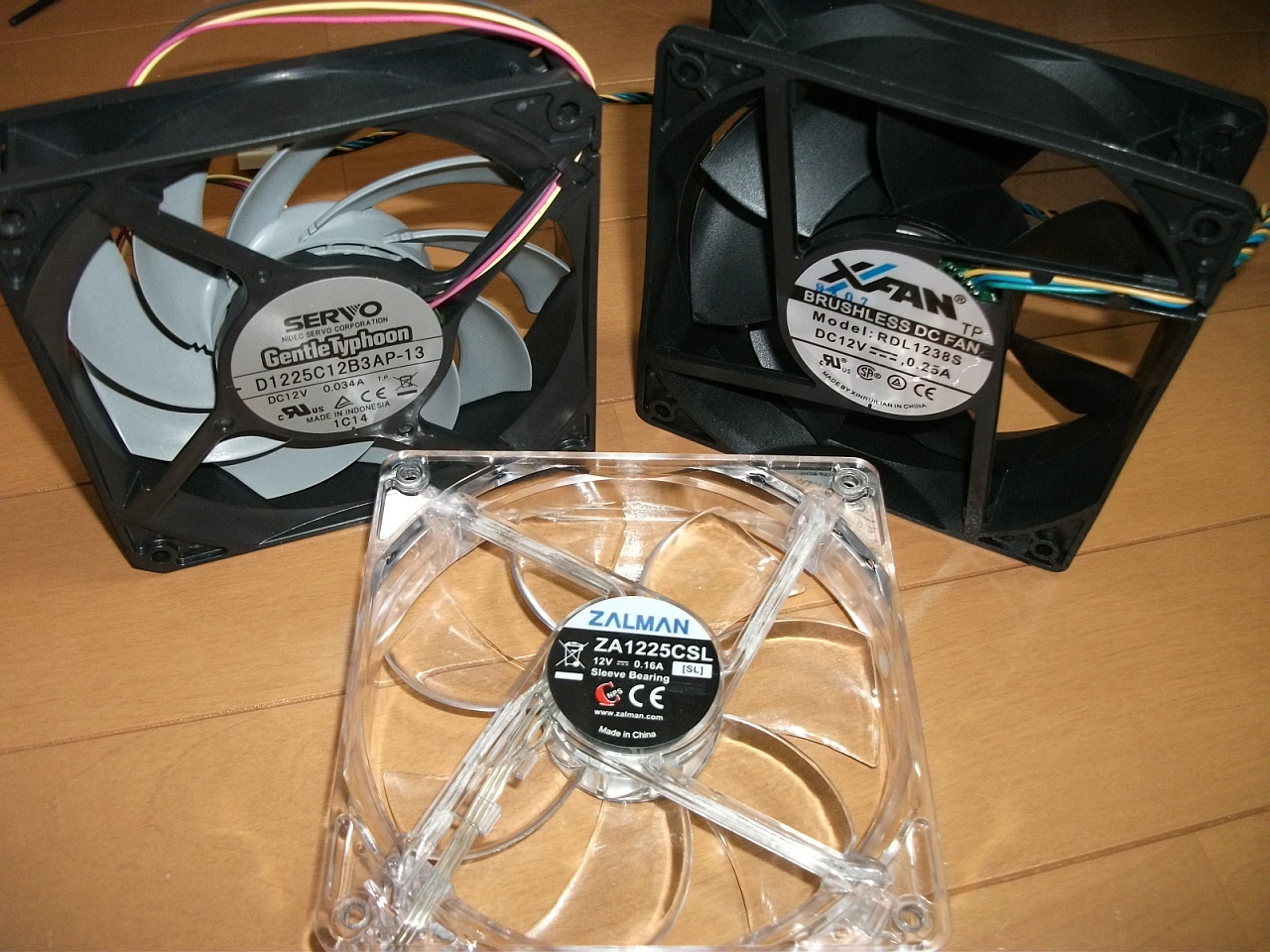 ファンは吹きつけ側にXinruilianのX-FAN RDL1238S-PWM、吸出し側に日本サーボのGentle Typhoon D1225C12B3 AP-13を取り付けました