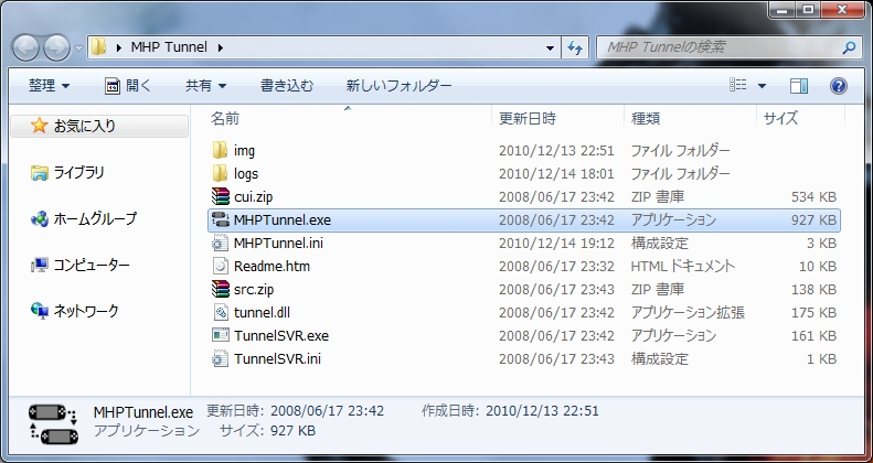 ダウンロードすると、"MHPTunnel.zip"という圧縮ファイルが落ちてくるので解凍ソフトなどで展開しましょう。