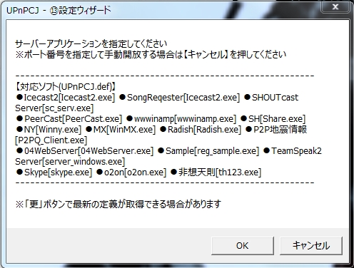 【Download】の欄にあるUPnPCJ129.ex_.zip(インストーラ)をダウンロードするといいでしょう。 "UPnPCJ129.ex_.zip"という圧縮ファイルが落ちてくるので解凍ソフトなどで展開しましょう。 (ほとんどの方は何もしなくてもOSに展開機能がありますのでダブルクリックで展開できるはずです) 展開すると、"UPnPCJ129.exe"というファイルが出てくるのでダブルクリックして実行してください。実行するとこんなウィンドウが出てくるのでキャンセルをクリックして下さい。 デスクトップに