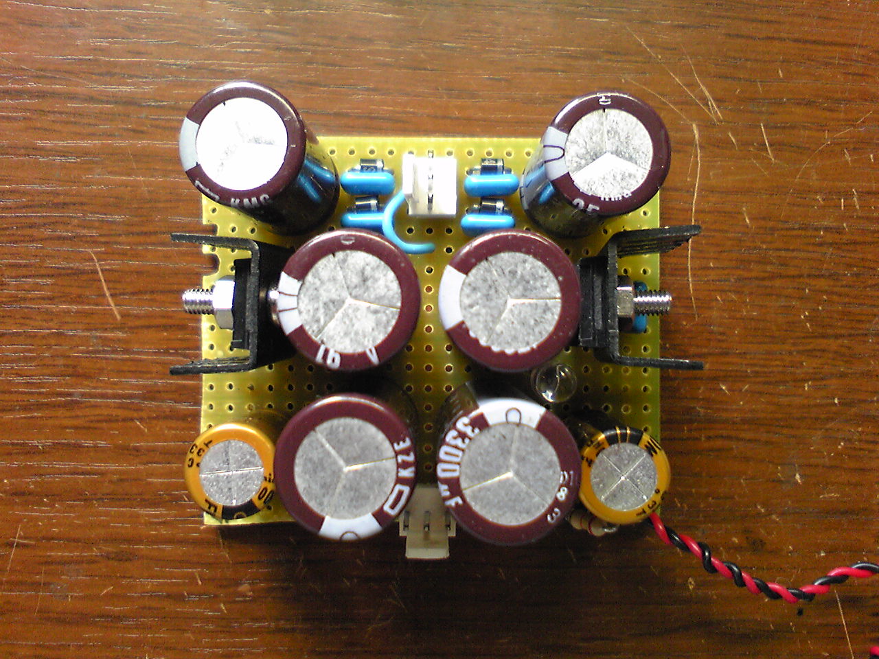 上の方はスペースが余ったので左右の回路にそれぞれ1000uFのニチコンFWと0.1uFのポリエステルフィルムコンデンサをつけました
