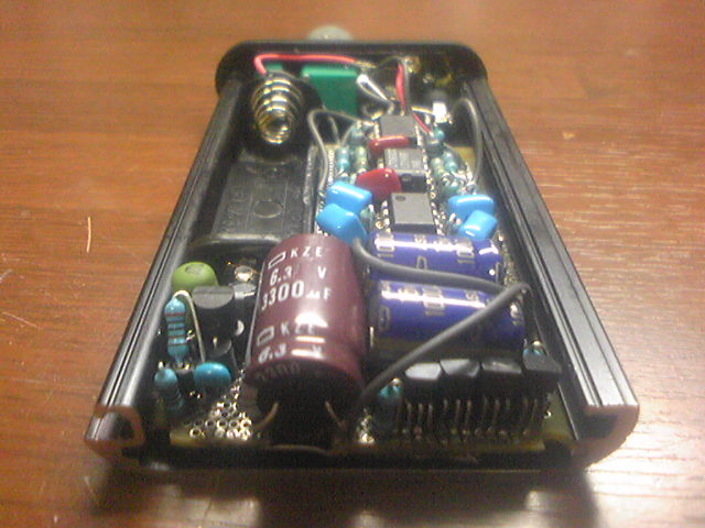 右下の緑のコイルがあるあたりが昇圧部分です。デカップリングコンもKZE3300uFを使いたかったのですが入りませんでした…もうちょっと詰め方考えれば入ったかも…