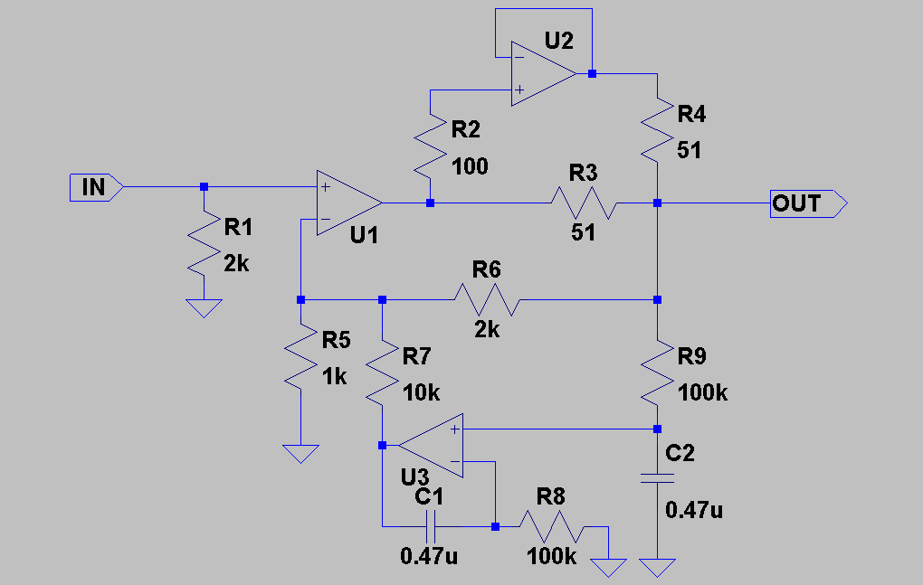 あとOPアンプの4、8番ピン直下とGNDの間をそれぞれ0.1uFほどのフィルムコンで繋いでやるといいでしょう(パスコン)