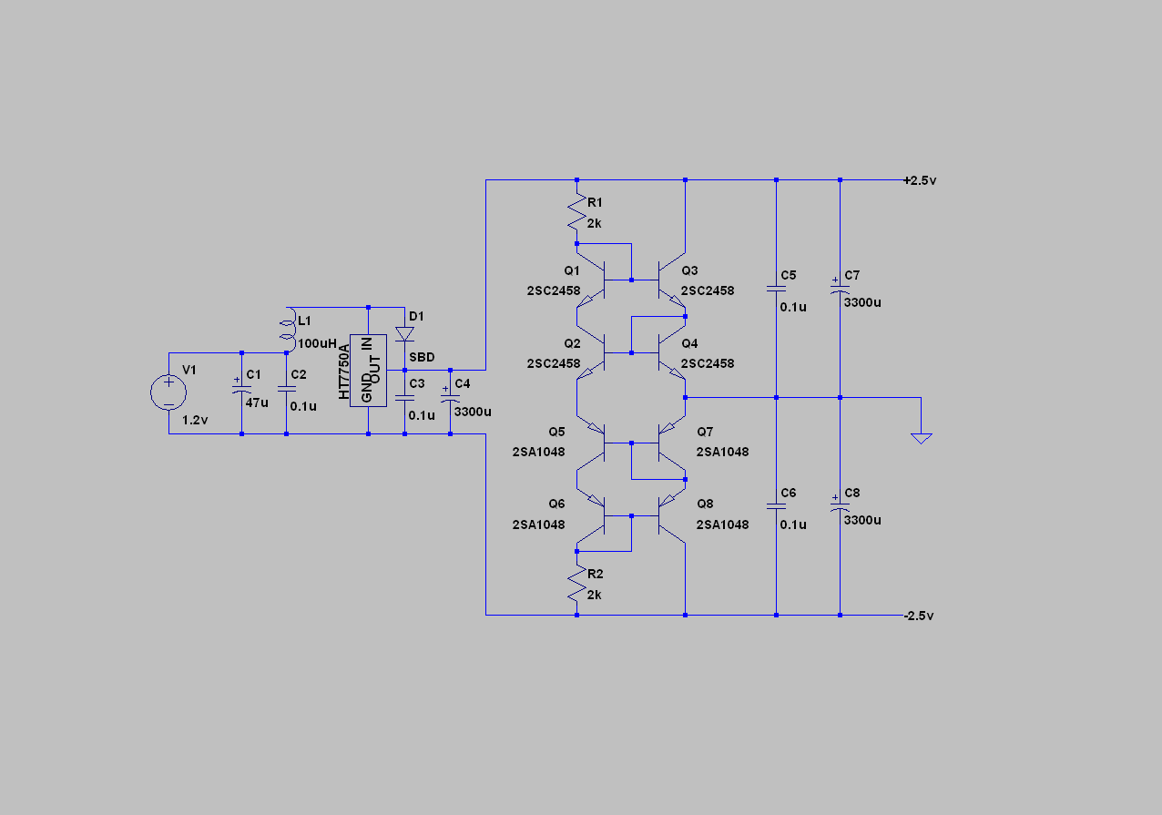 こちらが電源部。ニッケル水素電池からの1.2vをHT7750AというDC-DCコンバータで5vに昇圧し、カレントミラー回路を使ったエミッタフォロア分圧で+2.5v -2.5v GNDを作ります。