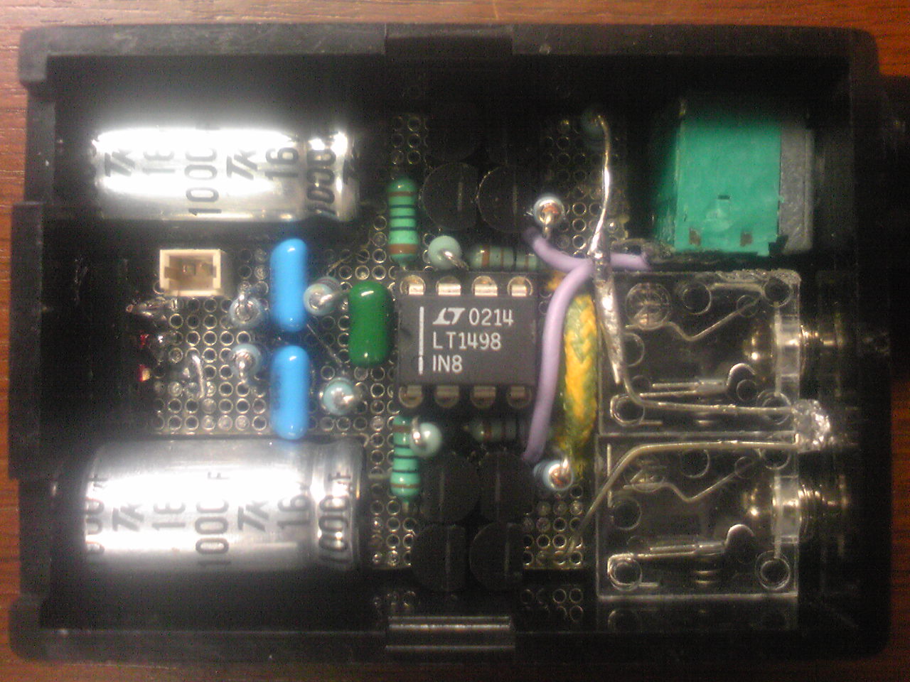 OPアンプと2SJ74/2SK170を使って適当にプラケースに押し込みました。久しぶりに小さいやつです。