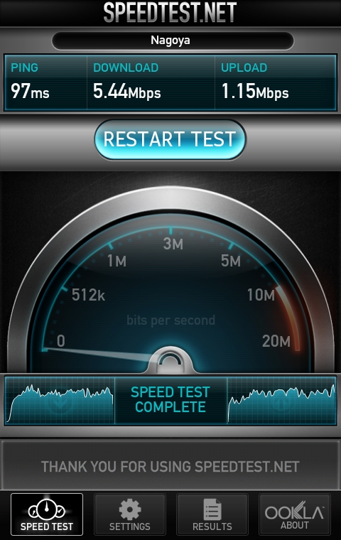 計測にはSPEEDTESTというアプリを使用し、テストサーバーは7/31の00:45の時点で国内では名古屋しか選択できなかったので名古屋にしています