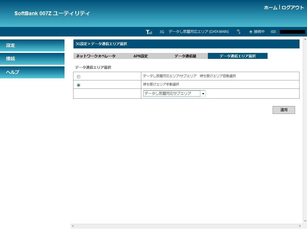 3、"設定"→"3G設定"→"データ通信エリア選択"と進むと↑のような画面になるので、"待ち受けエリア手動選択"の方にチェックをいれてプルダウンメニューで"データし放題対応サブエリア"を選んで"適用"ボタンを押せば常にサブエリアのみを使うようになります