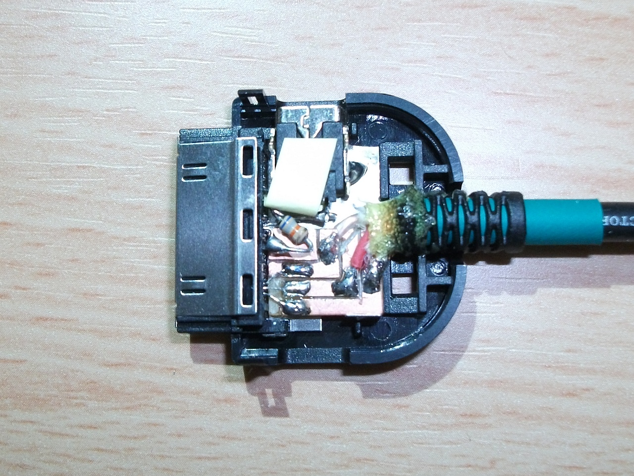 ピンに直結しないでこうやって基板など固定できるものを介して接続するとケーブルの引っ張りやねじれに強くなりiPodとの接触がよくなりますよ