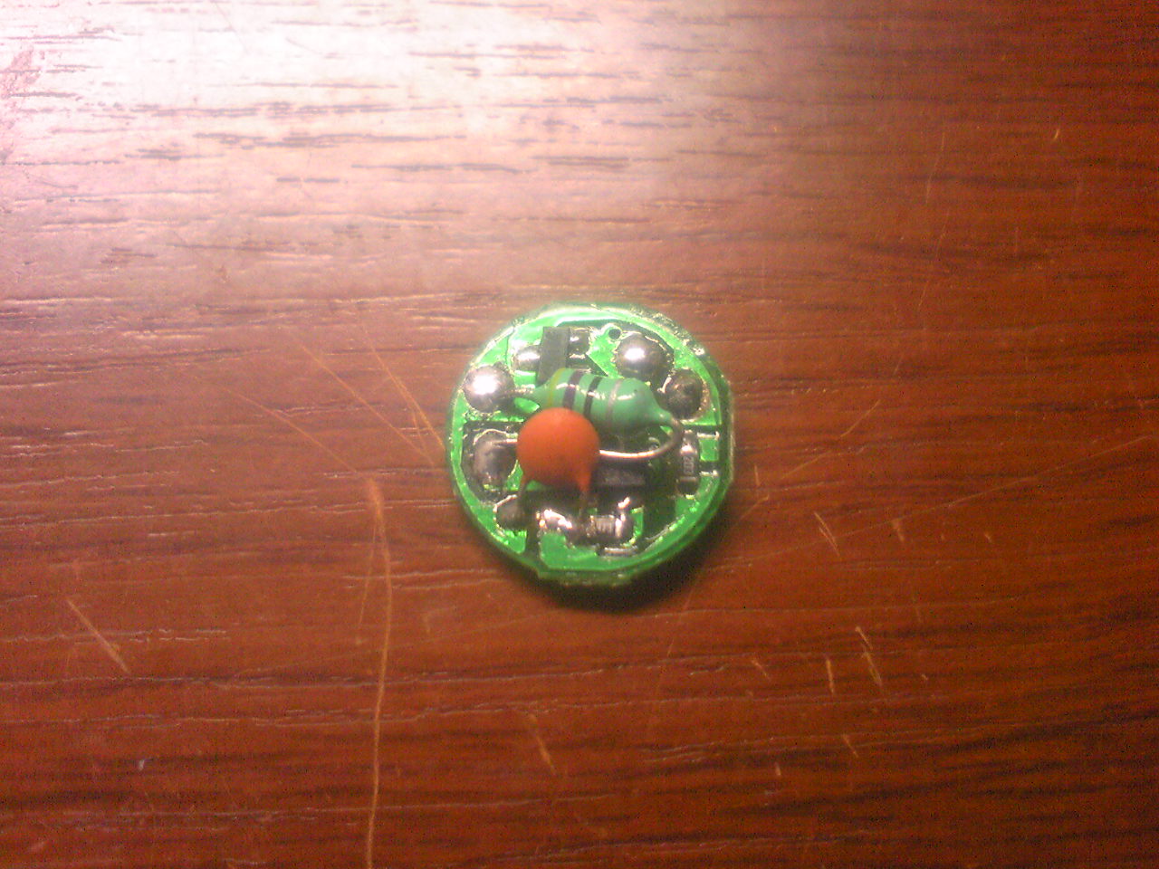始めLEDの輝度が低いだけかと思っていたのですが、ヘッドの部分を分解してみると中にはこんな基板が…(直径約1cm)