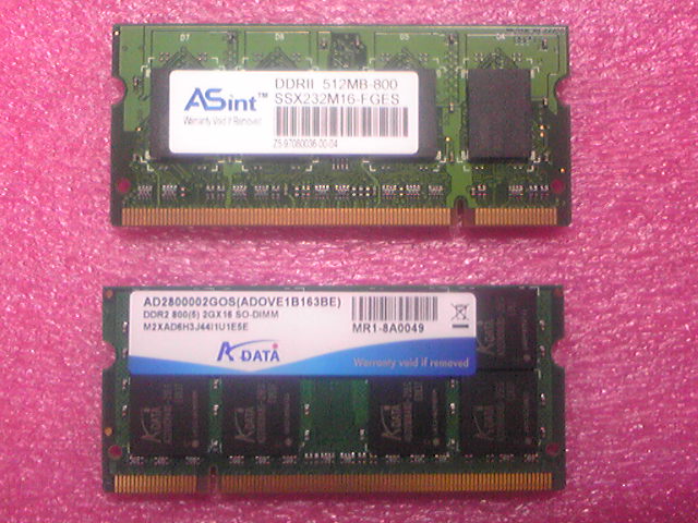 上がもともとついていたメモリー。DDR2 512MB-800と書いてあるので型番調べてみたら800MHz品でした。